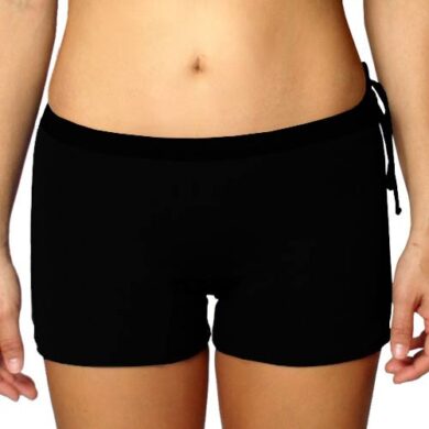 Alina Reversible Bottom He’e Nalu Gold. Reverses to Solid Black, Full Rear coverage, with hidden elastic around the legs for comfort and it won’t cut in to cheeks. Drawstring waistband can be tightened for a secure fit without muffin-top. A Perfect surf bikini bottom or for other vigorous activity if you want good bikini bottom coverage.