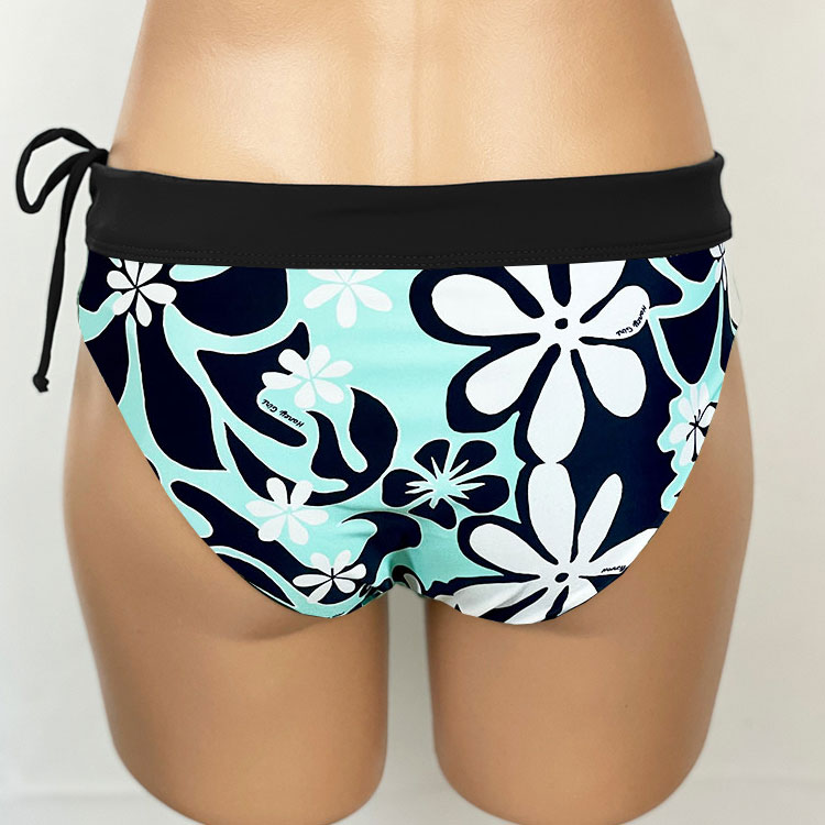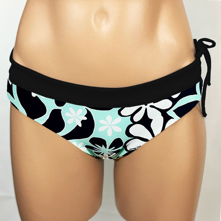 Alina Reversible Bottom Lei Aloha Black Ice Blue. Reverses to Black. Full Rear coverage, with hidden elastic around the legs for comfort and it won’t cut in to cheeks. Drawstring waistband can be tightened for a secure fit without muffin-top. A perfect surf bikini bottom or for other vigorous activity if you want good bikini bottom coverage. Our new prints are made of a high quality Recycled Nylon/Spandex, Made in the USA of imported fabric.
