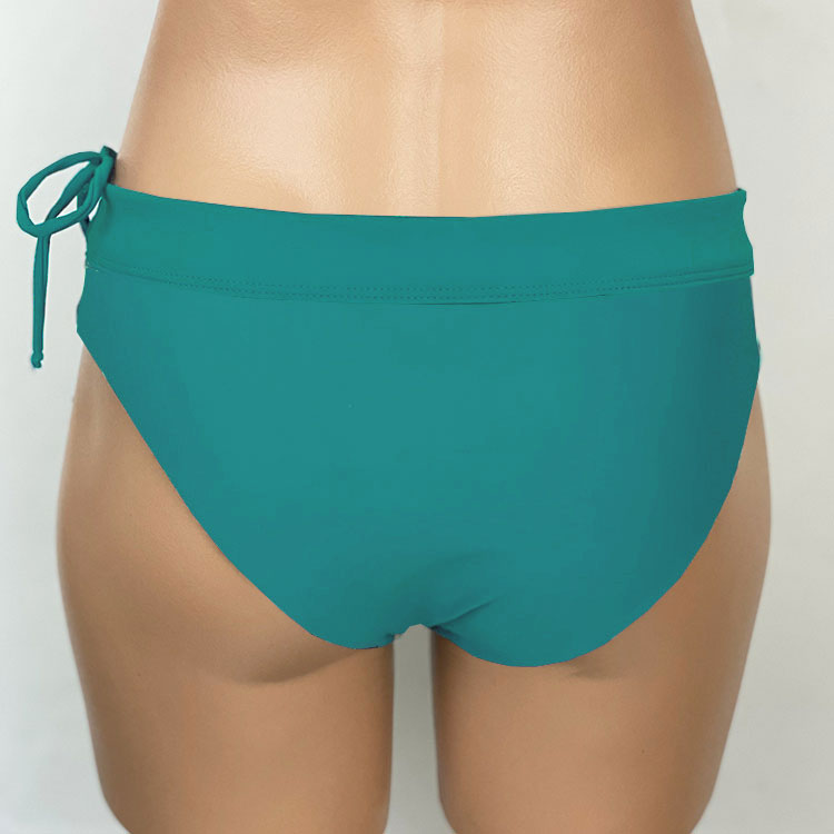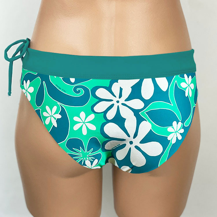 Alina Reversible Bottom Lei Aloha Sea Green. Reverses to Sea Green. Full Rear coverage, with hidden elastic around the legs for comfort and it won’t cut in to cheeks. Drawstring waistband can be tightened for a secure fit without muffin-top. A Perfect surf bikini bottom or for other vigorous activity if you want good bikini bottom coverage. Our new prints are made of a high quality Recycled Nylon/Spandex, Made in the USA of imported fabric.