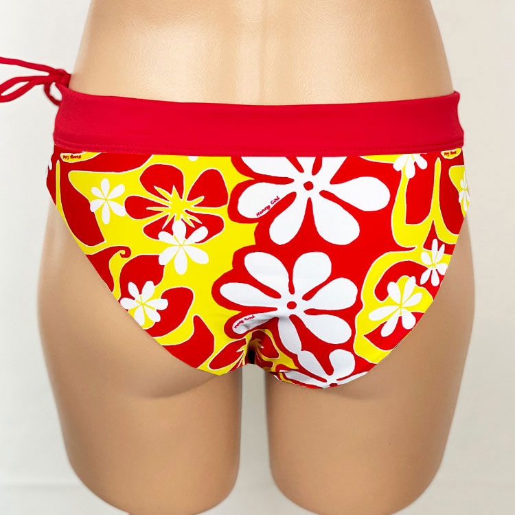Alina Reversible Bottom Lei Aloha Yellow & Red. Reverses to Red. Full Rear coverage, with hidden elastic around the legs for comfort and it won’t cut in to cheeks. Drawstring waistband can be tightened for a secure fit without muffin-top. A Perfect surf bikini bottom or for other vigorous activity if you want good bikini bottom coverage. Our new prints are made of a high quality Recycled Nylon/Spandex, Made in the USA of imported fabric.