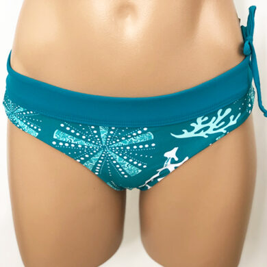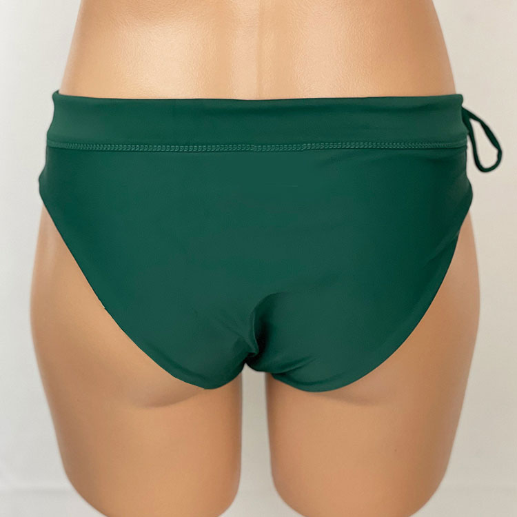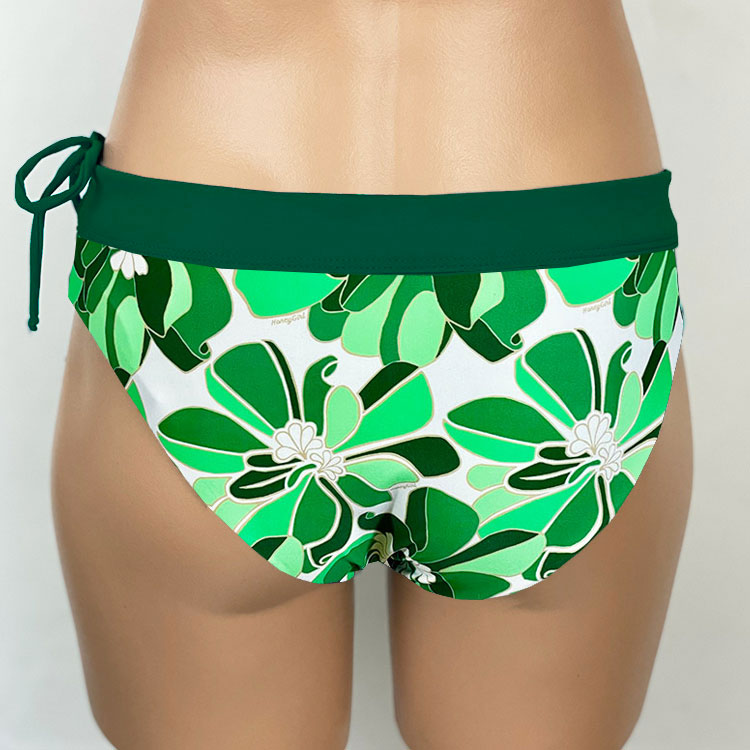 Alina Reversible Bottom Naupaka Green. Reverses to Forest Green. Full Rear coverage, with hidden elastic around the legs for comfort and it won’t cut in to cheeks. Drawstring waistband can be tightened for a secure fit without muffin-top. A perfect surf bikini bottom or for other vigorous activity if you want good bikini bottom coverage. Our new prints are made of a high quality Recycled Nylon/Spandex, Made in the USA of imported fabric.