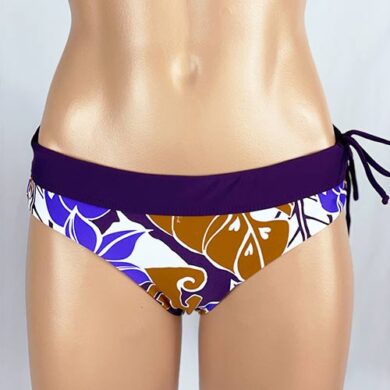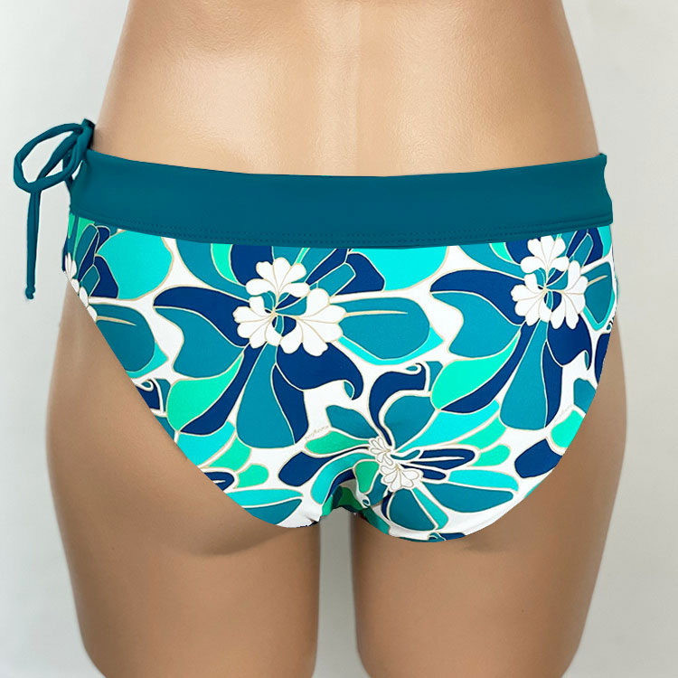 Alina Reversible Bottom Naupaka Ocean. Reverses to Ocean. Full Rear coverage, with hidden elastic around the legs for comfort and it won’t cut in to cheeks. Drawstring waistband can be tightened for a secure fit without muffin-top. A perfect surf bikini bottom or for other vigorous activity if you want good bikini bottom coverage. Our new prints are made of a high quality Recycled Nylon/Spandex, Made in the USA of imported fabric.