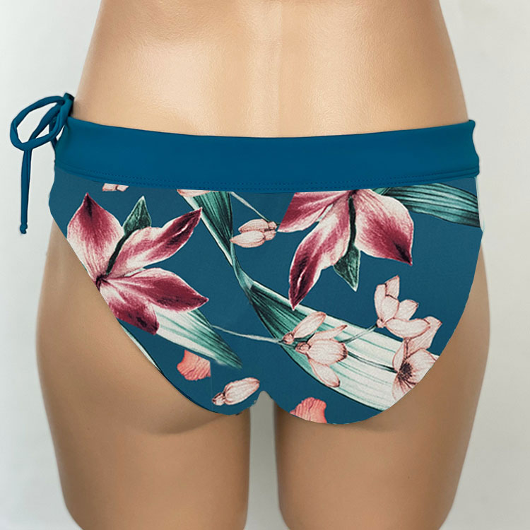 Alina Reversible Bottom Orchid Teal, reverses to Solid Ocean. Full Rear coverage, with hidden elastic around the legs for comfort and it won’t cut in to cheeks. Drawstring waistband can be tightened for a secure fit without muffin-top. A Perfect surf bikini bottom or for other vigorous activity if you want good bikini bottom coverage.