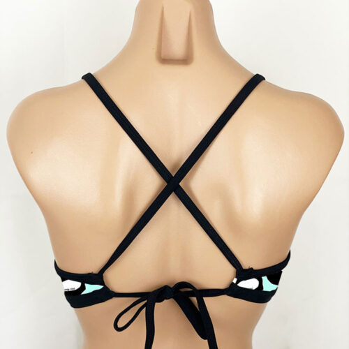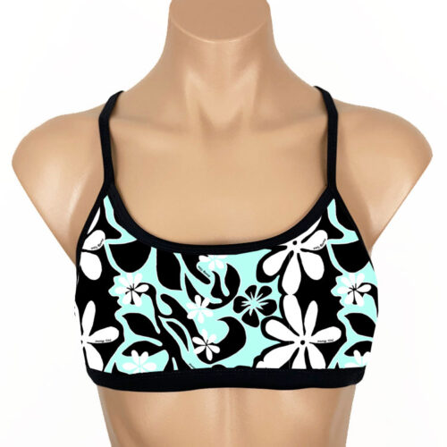 Ariel Reversible Sport Top Lei Aloha Black-Ice Blue, Reverses to Solid Black. NEW PRINT! Our Lei Aloha custom print is made of Recycled Nylon/Spandex. Lightly padded cups (padding sewn to an inner lining so it won’t scrunch up). Made in the USA of imported fabric.