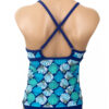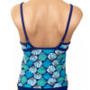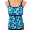Cathy Tankini Sunrise Shell Azure. Sunrise Shells Azure Blue with Blue Trim. The same fit as the Summer Tankini except we have added subtle gathers in the center front bodice for an easier fit. Also, wider under bust elastic for extra support. Bust is lined and lightly padded. (the cups are sewn to the lining so they don’t scrunch up on you). Straps can be worn crossed, with adjustable hooks. See sizing below, waist measurement is natural waist. If you prefer it to fit looser, you can go up a size and cross the straps.