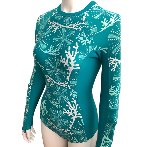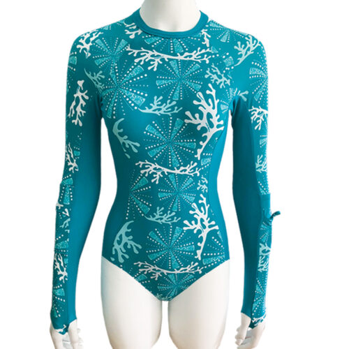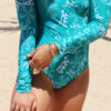 Beccy Long Sleeved One Piece Wana Lagoon, “Wana” Print (Sea Urchin and Coral) Color: Lagoon/Teal. Features: