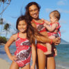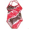 Girls One Piece Conch Ruby, with Red Trim. Sport top with adjustable cross back straps that tie, open scoop back. Full coverage in bust, hip, and rear. The sizes indicate the approximate age, and we have increased sizing in our new collection so it runs true to size.