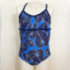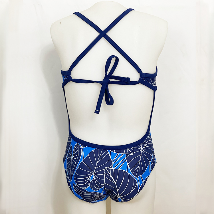 Girls One Piece Kalo Indigo, with Navy trim. Sport top with adjustable cross back straps that tie, open scoop back. Full coverage in bust, hip, and rear. The sizes indicate the approximate age, and we have increased sizing in our new collection so it runs true to size. For example 1T fits an average 1 year old, size 10 fits an average 10 year old.
