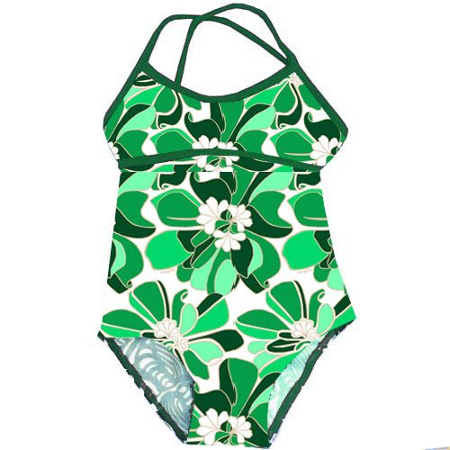 Girls One Piece Naupaka Forest, with Forest Green trim. Sport top with adjustable cross back straps that tie, open scoop back. Full coverage in bust, hip, and rear. The sizes indicate the approximate age, and we have increased sizing in our new collection so it runs true to size. For example 1T fits an average 1 year old, size 10 fits an average 10 year old.