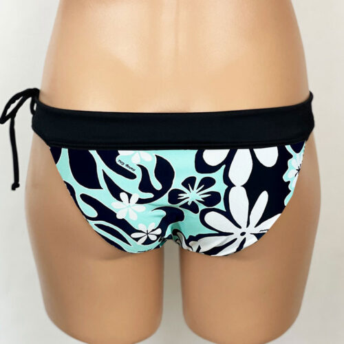 Heather Reversible Bottom Lei Aloha Black & Ice Blue, reverses to Black. Adjustable drawstring waistband, hidden elastic around legs. Low-rise bottom with moderate rear coverage. Our new prints are made of a high quality Recycled Nylon/Spandex. Made in the USA of imported fabrics.