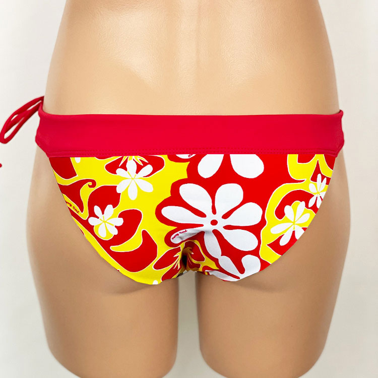 Heather Reversible Bottom Lei Aloha Yellow & Red, reverses to Red. Drawstring in waistband, hidden elastic around legs. Low-rise bottom with moderate rear coverage. Our new prints are made of a high quality Recycled Nylon/Spandex. Made in the USA of imported fabrics.