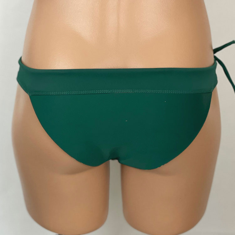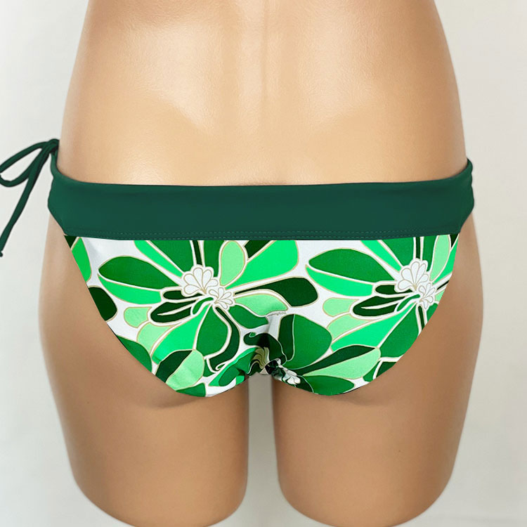 Heather Reversible Bottom Naupaka Green, reverses to Forest Green. Adjustable drawstring waistband, hidden elastic around legs. Low-rise bottom with moderate rear coverage. Our new prints are made of a high quality Recycled Nylon/Spandex. Made in the USA of imported fabrics.