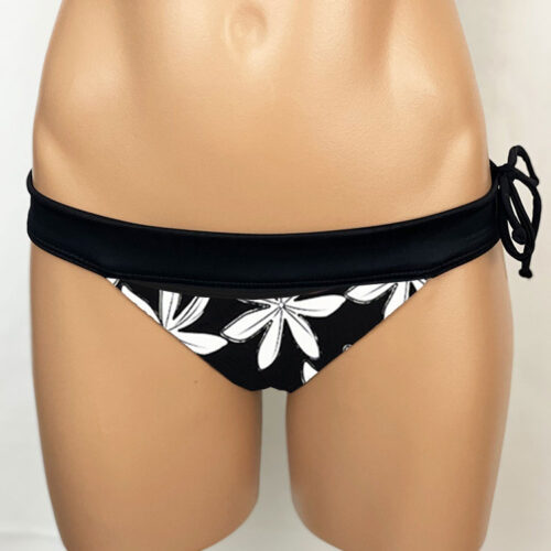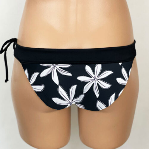Heather Reversible Bottom Tiare Black Print reverses to Solid Black. Drawstring in waistband, hidden elastic around legs. Low-rise bottom with moderate rear coverage. Made in the USA.