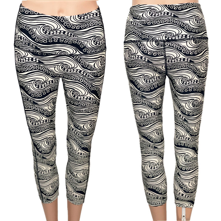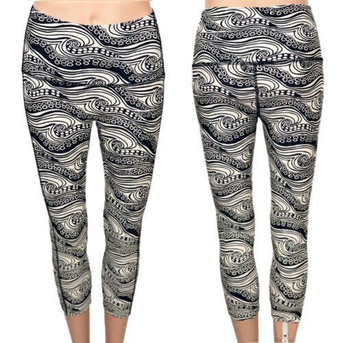SALE! He’e Nalu Ivory Rebecca Hi-Rise Capri Legging. UPF 50+, Made with a blend of RECYCLED Nylon, and Spandex specially made to withstand chlorine. Fold over waist to adjust for hi-rise or lowrise. Solid Black on the inside waistband. Dries quickly. No center seam in front. Perfect for yoga, workouts, and all water sports. XS-3XL available. Made in the USA of imported fabric.