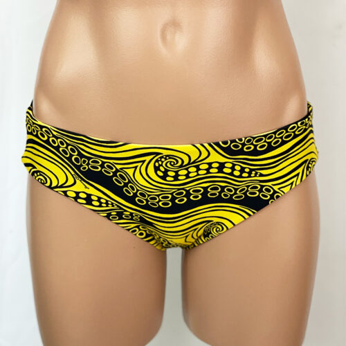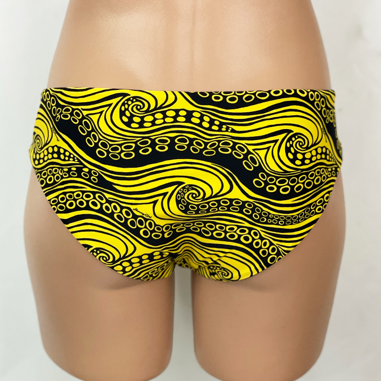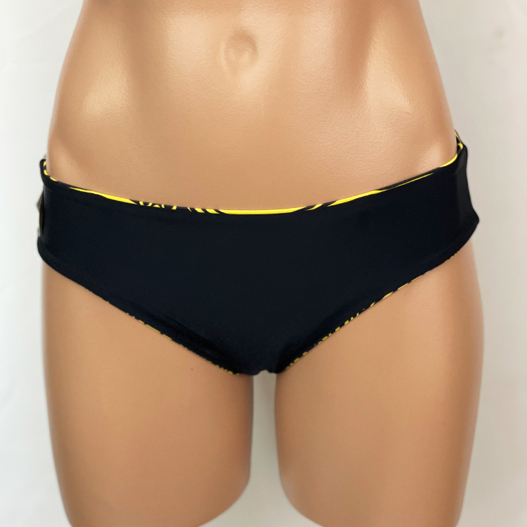Jackie Boyleg Bottom He’e Gold, Reverses to Black, Full Hip and Rear Coverage, Mid-Rise. Hidden elastic for a smooth fit. Similar coverage to Kristen Boyleg Bottom except with no ties. Our new prints are made of a high quality Recycled Nylon/Spandex, wet printed for color vibrancy and saturation, and spandex made to withstand chlorine. Made in the USA.