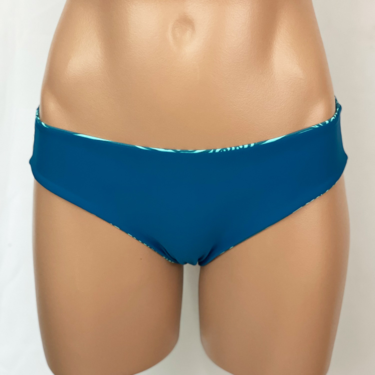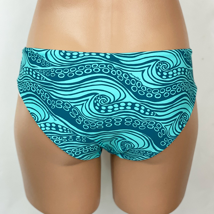 Jackie Boyleg Bottom He’e Surf, Reverses to Ocean Teal, Full Hip and Rear Coverage, Mid-Rise. Hidden elastic for a smooth fit. Similar coverage to Kristen Boyleg Bottom except with no ties. Our new prints are made of a high quality Recycled Nylon/Spandex, wet printed for color vibrancy and saturation, and spandex made to withstand chlorine. Made in the USA.