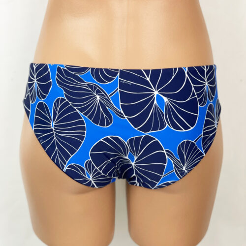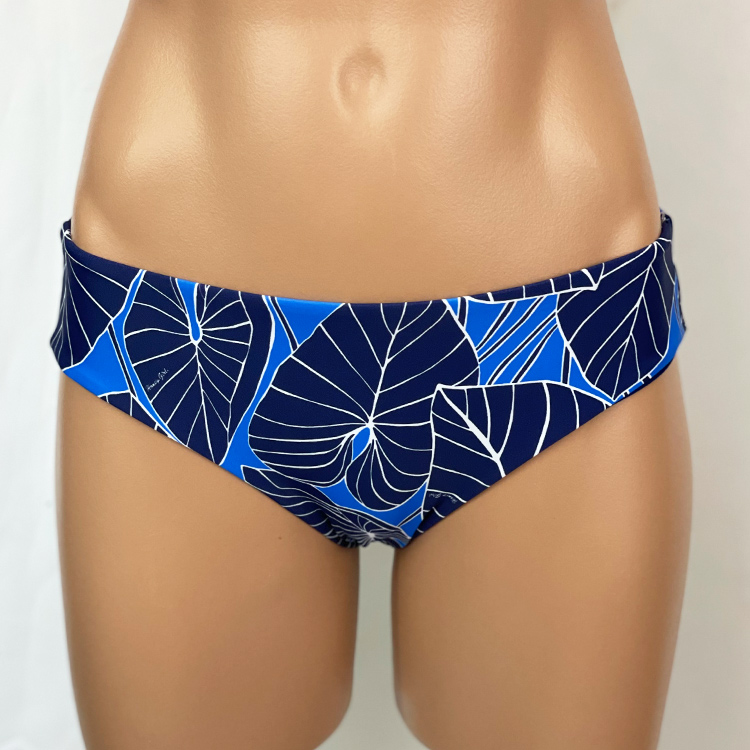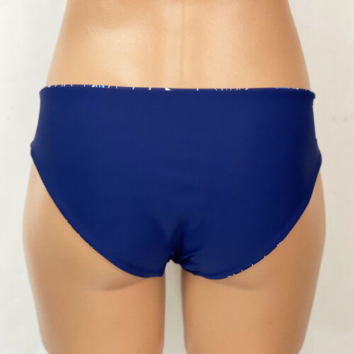 Jackie Boyleg Bottom Kalo Indigo, Reverses to Navy, Full Hip and Rear Coverage, Mid-Rise. Hidden elastic for a smooth fit. Similar coverage to Kristen Boyleg Bottom except with no ties. Our new prints are made of a high quality Recycled Nylon/Spandex, wet printed for color vibrancy and saturation, and spandex made to withstand chlorine. Made in the USA.