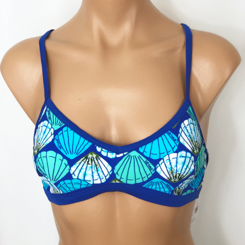 Jaimie Reversible Sport Sunrise Shell Azure, reverses to Cobalt Blue. Straps cross and tie in back. Lightly padded (padding sewn to an inner lining so it doesn’t scrunch up).