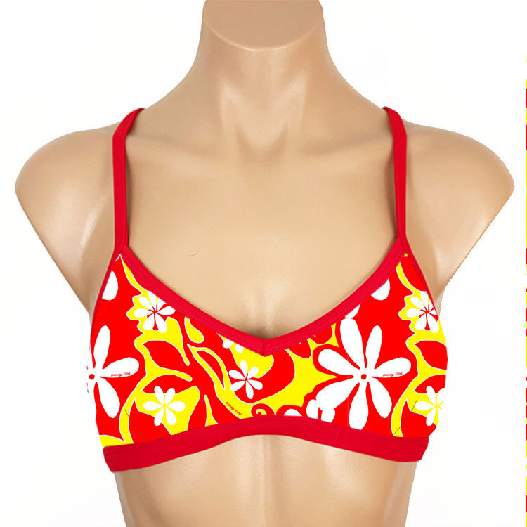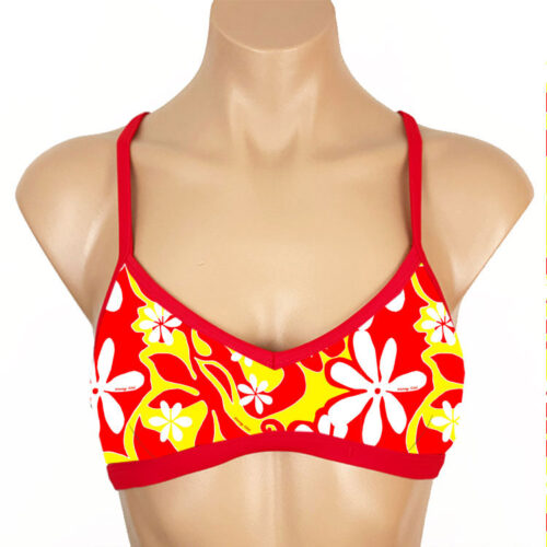 Jaimie Reversible Sport Top Lei Aloha Yellow & Red, reverses to Red. Sport Top Coverage with V-neck. Lightly padded (padding sewn to an inner lining so it doesn’t scrunch up). Adjustable straps cross and tie in back. Our new prints are made of a high quality Recycled Nylon/Spandex. Made in USA of imported fabric.