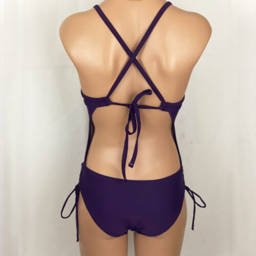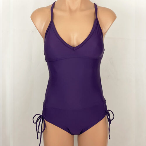 Joy Surf One Piece Solid Eggplant. Fully lined, cups are lightly padded (padding is sewn to lining so it won’t scrunch up). Adjustable cross-back tie straps. Adjustable hip coverage with cinch drawstring at hips. Full Coverage in rear, slightly cut away, looks like a bikini from the back.