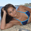Jules Reversible Triangle Sport Top Navy, reverses to Turquoise. Straps cross and tie in back. Lightly padded sewn to an inner lining so it won’t scrunch up.