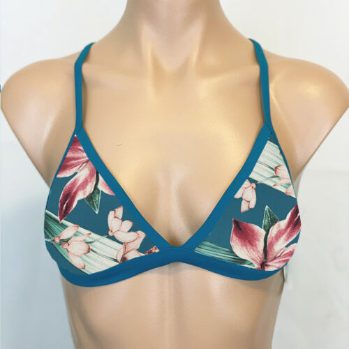 Jules Reversible Triangle Sport Top Orchid Teal, reverses to Ocean Teal. Straps cross and tie in back. Lightly padded sewn to an inner lining so it won’t scrunch up. Nylon/Spandex, Made in the USA. Now available without padding option.