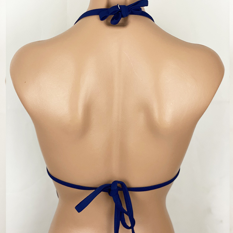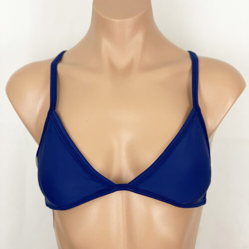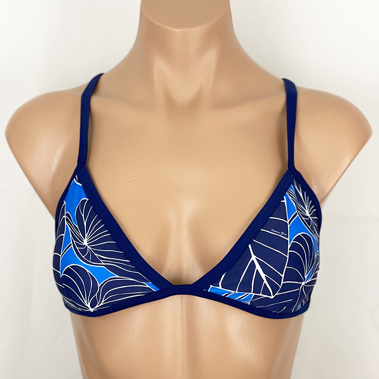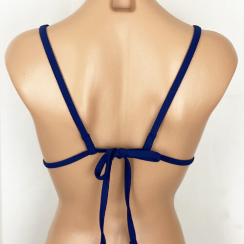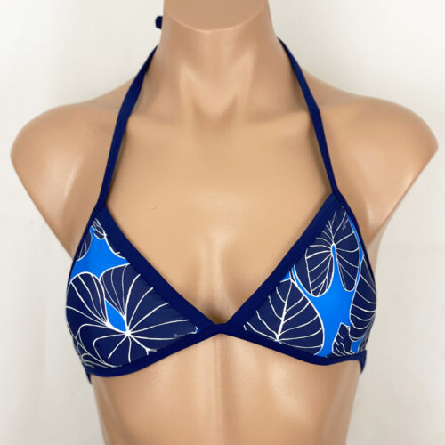 Kanani Convertible Triangle Top Kalo Indigo, reverses to Solid Navy. Fixed basic triangle coverage. 3/8″ elastic binding trim ties at neck and back. Convertible straps can be worn over the shoulders (by threading it through the special loops at the ends of the neck straps), or Halter style (tie at neck and back).