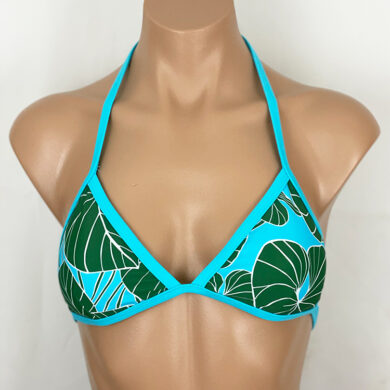 Kanani Convertible Triangle Top Kalo Peach, reverses to Cinnamon Brown. Fixed basic triangle coverage. 3/8″ elastic binding trim ties at neck and back. Convertible straps can be worn over the shoulders (by threading it through the special loops at the ends of the neck straps), or Halter style (tie at neck and back).