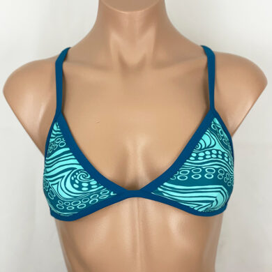 NEW! Kanani Reversible Triangle Top Mermaid Tail Blue, reverses to Solid Navy. Fixed basic triangle coverage. 3/8″ elastic binding trim ties at neck and back. Straps can also be worn over the shoulders by threading it through the special loops at the ends of the neck straps.