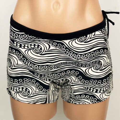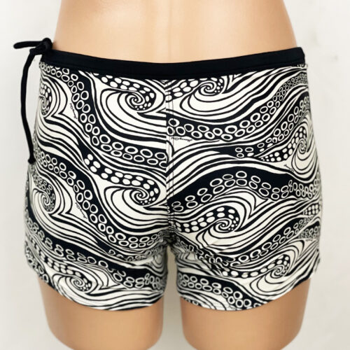 Kelly Reversible Shorts He’e Ivory, Reverses to Black. 3.5 inch inseam, flattering waistband with drawstring. Perfect for water sports (paddling, surfing, swimming), as well as land sports (running, yoga, working out). These shorts are stretchy and comfortable, and many customers can fit a size smaller in the Kelly Shorts, than their usual size Honey Girl bottoms.