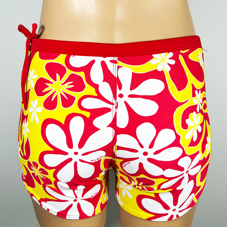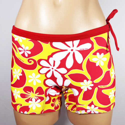 Kelly Reversible Shorts Lei Aloha Yellow-Red, Reverses to Red. 3.5 inch inseam, flattering waistband with drawstring. Perfect for water sports (paddling, surfing, swimming), as well as land sports (running, yoga, working out). These shorts are stretchy and comfortable, and many customers can fit a size smaller in the Kelly Shorts, than their usual size Honey Girl bottoms.
