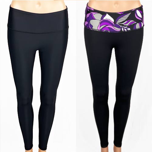 UPF 50+ Koa Mid-Rise Reversible Long Legging Solid Black with Gardenia Purple. Can be worn inside-out with Gardenia Purple print waistband (tear out paper tag). Also can be worn fold over waist to adjust for mid-rise or low-rise. Dries quickly. No center seam in front. Perfect for yoga, workouts, and all water sports. XXS and XS only