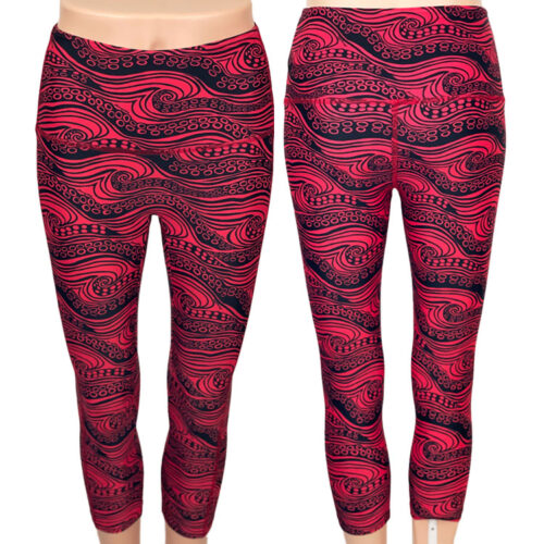 SALE! He’e Nalu Lava Rebecca Hi-Rise Capri Legging. UPF 50+, Made with a blend of Recycled Nylon, and Spandex specially made to withstand chlorine. Fold over waist to adjust for hi-rise or lowrise. Solid Red on the inside waistband. Dries quickly. No center seam in front. Perfect for yoga, workouts, and all water sports. XS-3XL available. Made in the USA of imported fabric.