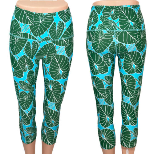 SALE! Kalo Cactus Sky Rebecca Hi-Rise Capri Legging. UPF 50+, Made with a blend of RECYCLED Nylon, and Spandex specially made to withstand chlorine. Fold over waist to adjust for hi-rise or lowrise. Solid Turquoise on the inside waistband. Dries quickly. No center seam in front. Perfect for yoga, workouts, and all water sports. XS-3XL available. Made in the USA of imported fabric.