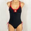 Miki Reversible One Piece Solid Red Black. Print: Solid Red, Reverses to Solid Black. Lightly Padded cups, cross back adjustable tie. Adjustable keyhole side ties at hips. XS=0-2, S=2-4, M=4-i6, L=6-8, XL=8-10. Approximate cup sizes per size: XS, S, M fits A-C cup, L-XL fits B-D cup. If you have a longer torso, or are tall, go up a size, and the hips are adjustable so you can make it tighter if needed.