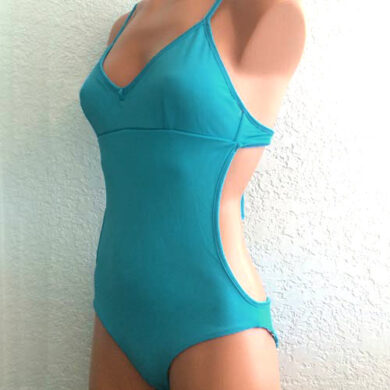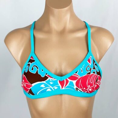 Sport top with cross back adjustable tie. Cut away sides, looks like a bikini from the back. This torso length is slightly longer than the Miki Reversible One Piece, and is very secure in the surf or for any water activity. XS=0-2, S=2-4, M=4-6, L=6-8, XL=8-10