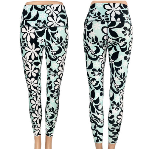 NEW! Lei Aloha Black & Ice Blue Koa Ankle Legging. You can fold over waist to adjust waist to lowrise. Solid Black on the inside waistband. No center seam in front. Perfect for yoga, workouts, and all water sports. XS-XXL available. Our new Lei Aloha Print is made of Recycled Nylon 80% / 20% Spandex, 4-way stretch. Made in the USA of imported fabric.