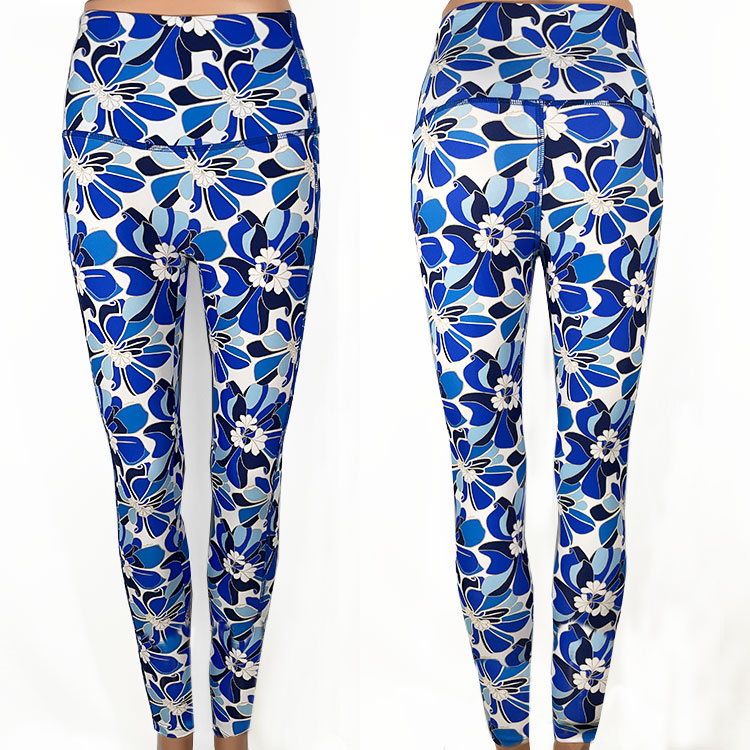 NEW! Naupaka Royal Blue Koa Ankle Legging. You can fold over waist to adjust waist to lowrise. Solid Royal Blue on the inside waistband. No center seam in front. Perfect for yoga, workouts, and all water sports. XS-XXL available. Our new Naupaka Print is made of Recycled Nylon 80% / 20% Spandex, 4-way stretch. Made in the USA of imported fabric.