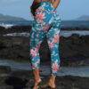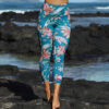 SALE! Orchid Teal Hi-Rise Capri Legging. UPF 50+ Nylon/Spandex. You can fold over the waist to adjust to lowrise. Solid Ocean on the inside waistband. Dries quickly. No center seam in front. Perfect for yoga, workouts, and all water sports. XS-3XL available. MADE IN USA. Model is wearing XS and has a 34″ hip and 25″ waist.