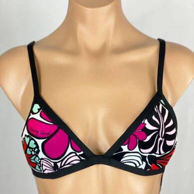 Pili Reversible Sport Top Lei Aloha Sea Green, reverses to Sea Green. Pili Reversible sport top is a pull-over style triangle sport top with full coverage than a basic triangle top. It’s perfect for ocean activities, and also paddling, working out, and yoga. Special feature sport back which can be worn racer-back or separate to adjust where it sits on your shoulders. Our new prints are made of a high quality Recycled Nylon/Spandex. Made in the USA