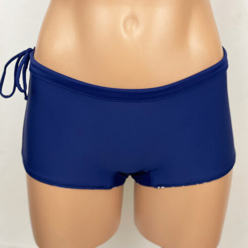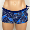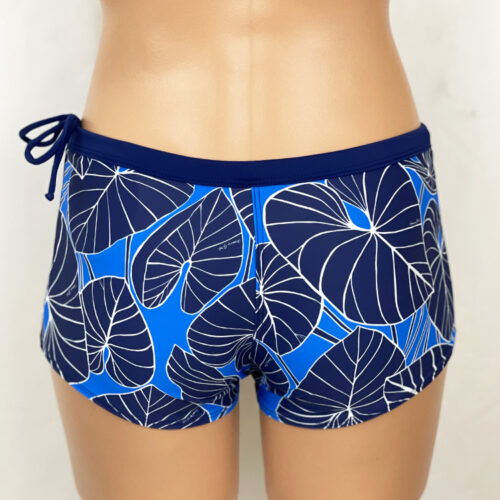 Pipeline Reversible Hipster Shorts Kalo Indigo, Reverses to Navy. 1.5 inch inseam, low rise, flattering waistband with drawstring. Our new prints are made of a high quality Recycled Nylon/Spandex, wet printed for color vibrancy and saturation, and spandex made to withstand chlorine. Made in the USA.