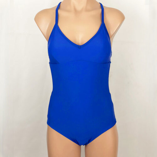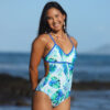 Rachel Reversible One Piece Watercolor Laua’e, reverses to Royal Blue. Nylon/Spandex. Full hip and seat coverage, sport top with light pads sewn into an inner lining so it doesn’t scrunch up. Hidden elastic around legs and back for comfort. Made in the USA.