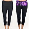 SALE! Solid Black with Purple Gardenia Rebecca Hi-Rise Reversible Capri XXS & XS. Fold over waist to adjust for hi-rise or lowrise. Gardenia Purple Print on the inside waistband. Dries quickly. No center seam in front. Perfect for yoga, workouts, and all water sports. Made in the USA of imported fabric.
