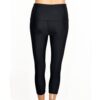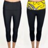 SALE! Solid Black Capri Legging with Yellow XXS. Fold over waist to adjust for hi-rise or lowrise. Tiare Nui Yellow Print on the inside waistband. Dries quickly. No center seam in front. Perfect for yoga, workouts, and all water sports. Made in the USA of imported fabric.
