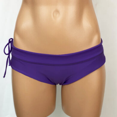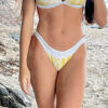 Traci Reversible Brazil Bottom Bamboo Yellow, reverses to Solid White. Lowrise bottoms with skimpy rear coverage. Drawstring in the waistband holds this bottom in place even in big surf. Nylon/Spandex, Made in the USA. The model is wearing a size Small, high hip measurement (around hip bones) is 31″.