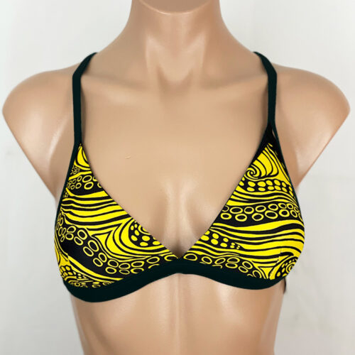 Waimea Reversible Sport Top He’e Gold, Reverses to Solid Black. Fuller coverage triangle top. Straps cross and tie in back. Lightly padded cups sewn to an inner lining so it won’t scrunch up. Our new prints are made of a high quality Recycled Nylon/Spandex, wet printed for color vibrancy and saturation, and spandex made to withstand chlorine. Made in the USA.