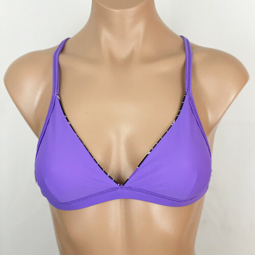 Waimea Reversible Sport Top Kalo Lilac, Reverses to Solid Lilac. Fuller coverage triangle top. Straps cross and tie in back. Lightly padded cups sewn to an inner lining so it won’t scrunch up. Our new prints are made of a high quality Recycled Nylon/Spandex, wet printed for color vibrancy and saturation, and spandex made to withstand chlorine. All our suits are made in the USA.