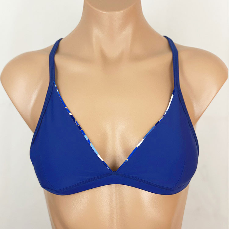 Waimea Reversible Sport Top Naupaka Royal, Reverses to Solid Royal Blue. Fuller coverage triangle top, fits like a demi bra. Straps cross and tie in back. Lightly padded cups sewn to an inner lining so it won’t scrunch up. Our new prints are made of a high quality Recycled Nylon/Spandex. Made in the USA of imported fabric.
