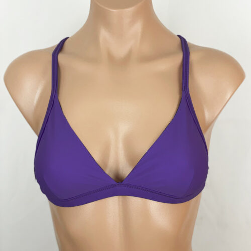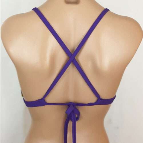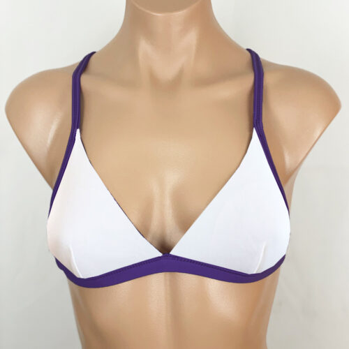 Waimea Reversible Sport Top Purple, Reverses to solid White. Fuller coverage triangle top. Straps cross and tie in back.
