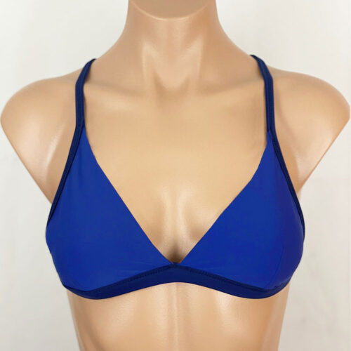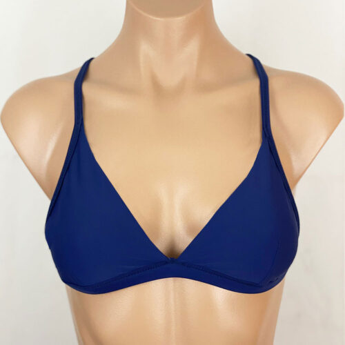 Waimea Reversible Sport Top Solid Navy reveses to solid Royal Blue. Fuller coverage triangle top. Straps cross and tie in back. Lightly padded cups sewn to an inner lining so it won’t scrunch up. XS=32A-34A S=34A-34B M=34B-34C L=36C-34D XL=36D-34DD XXL=36DD